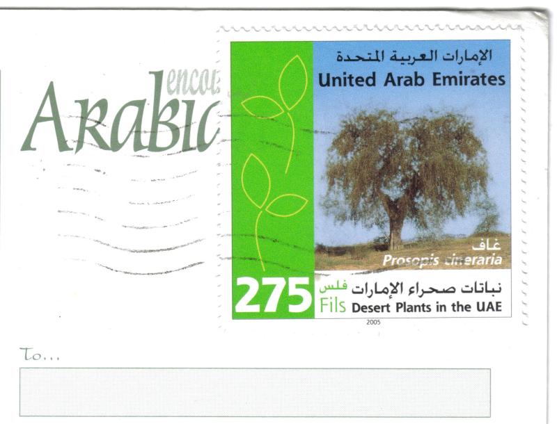 the stamp JP used was issued in 2005 in a set of 6 Desert Plants in the UAE stamps, with this one featuring the Prosopis cineraria.