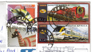 the train card comes with, among else, two fantastic train stamps, issued in 2010 in a set of 10 train stamps, commemorating the 150th Anniversary of South African Railways.