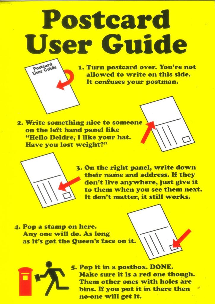 Well, the whole text is on the card, so I will let you read it yourselves and have a laugh at this Postcard User Guide for Dummies...seriously, I wouldn't be surprised if some people actually needed something like this....