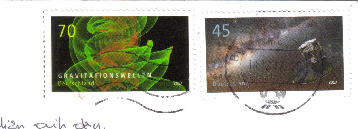 Agi used this super cool set of Astrophysics stamps issued in 2017! The stamp on the left shows gravitational waves, while the one on the right shows the GAIA Satelite.